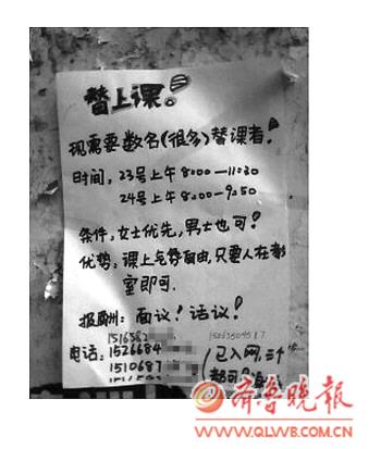 陳洋洋 來(lái)源:齊魯晚報(bào)[提要] 學(xué)生在宣傳欄上貼出的征人代替上課的廣告!捌綍r(shí)我們找替課的少,學(xué)校查得不嚴(yán)的話,我們可以請(qǐng)假或者逃課!彼f(shuō),學(xué)生到了大四逃課的是不少,“但是考慮到學(xué)生也是為了好的前途,就比較理解,多數(shù)老師也不忍心太為難他們。