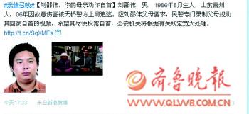 王若松 來源:齊魯晚報[提要] 7日,天橋公安通過官方微博發(fā)布一條“劉邵偉,你的母親勸你自首”的逃犯父母規(guī)勸視頻,希望借助微博的力量,讓嫌疑人早日回來自首。這也是公安機關(guān)通過微博發(fā)布逃犯親屬規(guī)勸逃犯自首的首次嘗試。