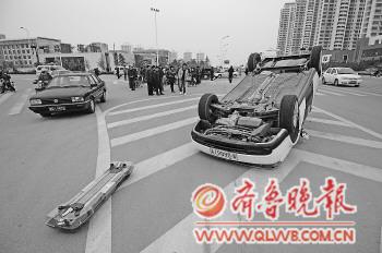 6日下午2時許,記者在事發(fā)的十字路口看到,一輛銀色的轎車停在路口中間,車頭已經(jīng)嚴(yán)重受損,旁邊一輛黑色轎車車頭同樣受損嚴(yán)重。而在十字路口西南角,一輛車牌號為魯Q8861警的警車“四腳朝天”,仰翻在路面上。