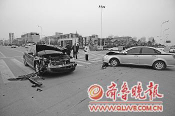 來源:齊魯晚報[提要] 6日下午2時許,記者在事發(fā)的十字路口看到,一輛銀色的轎車停在路口中間,車頭已經(jīng)嚴(yán)重受損,旁邊一輛黑色轎車車頭同樣受損嚴(yán)重。據(jù)目擊者趙先生講,6日下午1時40分左右,他正駕駛公交車到達(dá)沂蒙路與天津路十字路口,該路口信號燈發(fā)生故障,一直為紅燈,他只能停車等待。