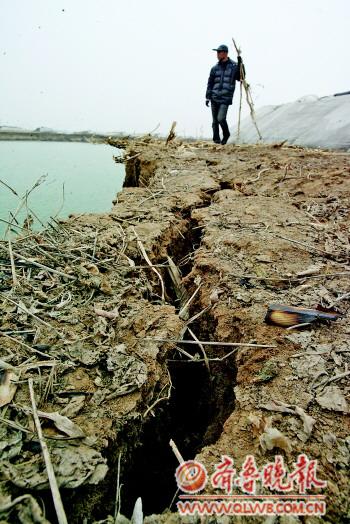 于瀟瀟 李濤 來源:齊魯晚報(bào)[提要] 蔬菜大棚邊的土不停塌陷,村民們每天干活都提心吊膽。水塘周邊的其他幾個(gè)大棚,也因土壤塌陷,地錨紛紛露出地面,鐵絲隨處可見。記者數(shù)了一下,在池塘周邊共有7個(gè)蔬菜大棚,因池水沖擊土壤塌陷,大棚地錨裸露在地面上。