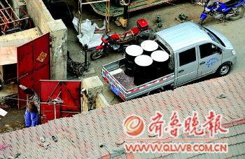 3月9日下午2時許,一輛滿載鐵皮油桶的白色卡車開進濟南張莊路的一個院子里,同時,紅色鐵門應聲關閉。幾名工人從廠房內(nèi)走出,開始把油桶從車上卸下,工人們卸下了近20桶。