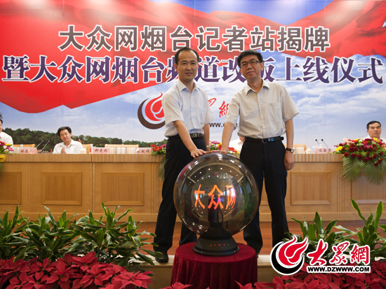 大眾報(bào)業(yè)集團(tuán)黨委常委、副總編輯郝克遠(yuǎn)(右)與煙臺市委宣傳部副部長陳海濤(左)按下水晶球開通新版大眾網(wǎng)煙臺頻道