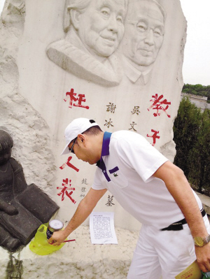 通過在微博上爆料的網(wǎng)友,記者聯(lián)系到吳山本人。吳山承認(rèn)這件事情確實(shí)是自己所為,但是“被逼無奈”,如果不是萬不得已,自己不會揭露這些家丑。吳山說:“我當(dāng)時還想把墓碑給砸了,后來被自己的幾個朋友給攔住了。所以在上面寫了八個字‘教子無方 枉為人表’!