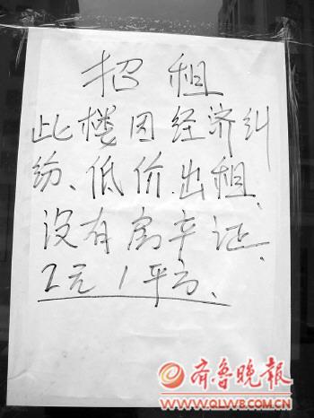 記者看到,在售樓處上鎖的玻璃門上,除了貼了一張“已售完”的紙外,在另一扇門上還被人從里面貼上了手寫的“招租廣告”:此樓因經(jīng)濟(jì)糾紛低價(jià)出租,沒有房產(chǎn)證,2元/平方。