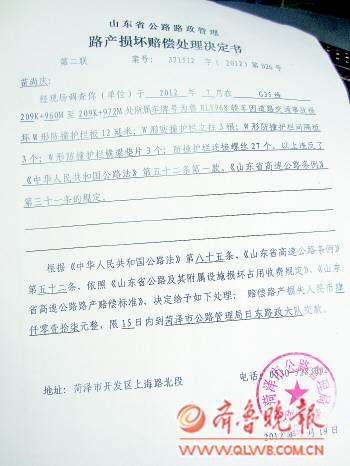 ▲日東(日南)高速公路菏澤路政管理大隊(duì)給苗先生開具的賠償處理決定書。