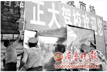 執(zhí)法人員將黑駕校宣傳招生廣告牌揭下。齊魯晚報記者邱志強攝