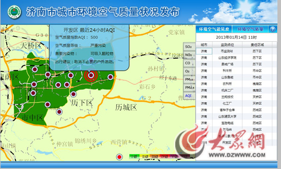 濟(jì)南市開發(fā)區(qū)等4個監(jiān)測點(diǎn)的空氣質(zhì)量指數(shù)(AQI)均達(dá)到監(jiān)測的極值500。