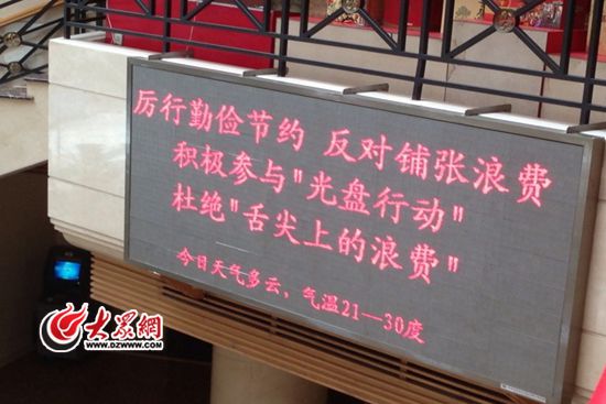 距中秋只有三天,山東新聞大廈餐飲訂單只有一份。圖為山東新聞大廈打出了“厲行勤儉節(jié)約,反對鋪張浪費”的電子標語