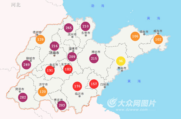 截至13日上午11:00,山東17市空氣質(zhì)量整體“飄紅”,已有濟(jì)南、濱州、東營(yíng)、聊城、淄博、濰坊、棗莊、菏澤8個(gè)市空氣質(zhì)量達(dá)到重度污染,其中菏澤污染最嚴(yán)重,AQI指數(shù)達(dá)到282;泰安、萊蕪、臨沂、日照4市中度污染;一向表現(xiàn)優(yōu)異的威海、煙臺(tái)也雙雙“淪陷”,與德州、濟(jì)寧一起達(dá)到輕度污染;17市中,僅青島仍在“堅(jiān)守”,空氣質(zhì)量為良好,AQI指數(shù)達(dá)到96。