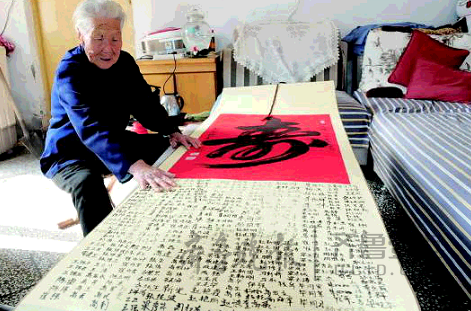 這幅“壽”字上面的簽名有300多個(gè),簽名者都是經(jīng)孫大娘之手接生的孩子。齊魯晚報(bào)·齊魯壹點(diǎn)記者 李洋 攝