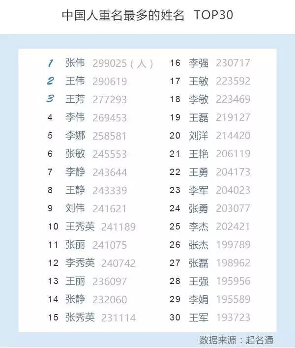 2014年,起名通曾公布了一份“中國重名最多的姓名TOP30”,高居榜首的“張偉”在全國高達(dá)約29.9萬人。要知道,冰島一個國家的人口也就33萬左右。