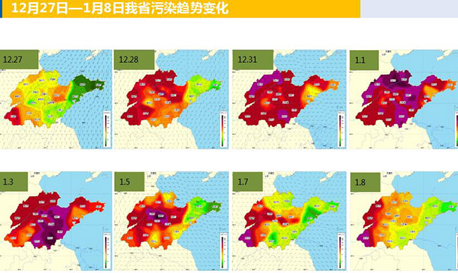 山東省環(huán)境信息與監(jiān)控中心預(yù)報(bào)預(yù)警室副主任曲凱介紹,據(jù)統(tǒng)計(jì),2016年供暖季以來,我省一共經(jīng)歷了9次重污染過程,與去年同期持平,其中11月份4次,12月份5次。重污染的持續(xù)時(shí)間2-11天不等;影響范圍涉及了全省大部分地區(qū),魯西北地區(qū)的污染頻次最高,其次是魯西南和魯中地區(qū);12月18日以來的這2次過程污染最嚴(yán)重,其中12月18日這次污染程度最重,出現(xiàn)了多個(gè)城市AQI爆表的情況,12月28日這次持續(xù)時(shí)間最長,重污染持續(xù)了12天。