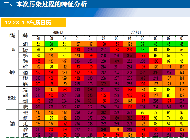 曲凱說,此次污染范圍十分廣,全省17城市均不同程度出現(xiàn)了重污染過程,其中元旦假期的污染范圍最大,從AQI日均值分布上看,全省有16個(gè)城市達(dá)到了重度或嚴(yán)重污染,威海市雖然是中度污染水平,但也出現(xiàn)了短時(shí)達(dá)到重度污染的情況。