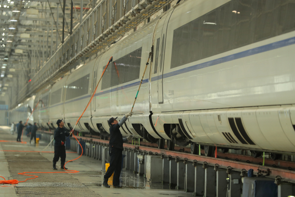 1月10日上午,濟(jì)南鐵路局高鐵清洗組的工人們正在進(jìn)行清洗作業(yè)。