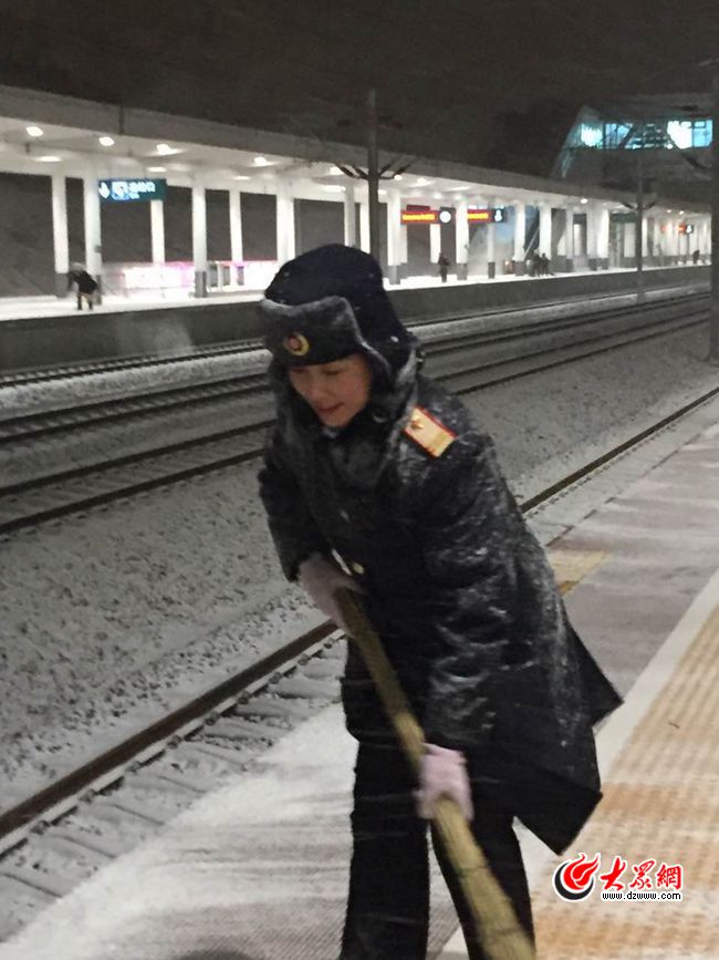 下午5點27分,一輛從威海駛來的列車上有一位剛做完手術(shù)的老人,行動不太方便 。李好提前準備好了輪椅,在站臺等候,等老人到站后,一路推著老人直到老人上車離開。晚上7點,李好帶著大家在站臺上清掃了兩個多小時的積雪,晚上九點半才回到宿舍,倒頭就睡。這個夜晚,她又將在站上度過。