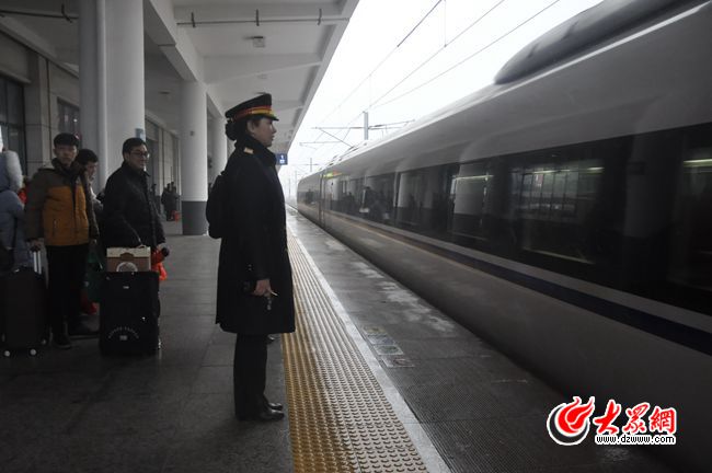 19日下午,煙臺南站客運主任李好先是手把手教給五名青年志愿者,如何幫助旅客使用自動取票機。接著又回到候車室引導(dǎo)旅客檢票,去安檢處幫著一起看安檢儀。列車來了,她又冒著風(fēng)雪到站臺上維持秩序,直到旅客全部安全上車,看看列車駛出站臺,她才回到屋內(nèi)。
