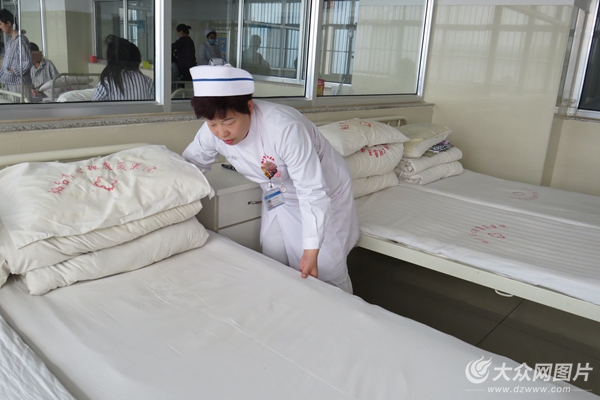 精神科的工作很瑣碎,除了要為患者提供醫(yī)療服務(wù)外,還要照顧患者的生活。護士長李清華在幫助患者整理床鋪后,推著掃床車,將洗衣房清洗干凈的被服送到倉庫分類放置。