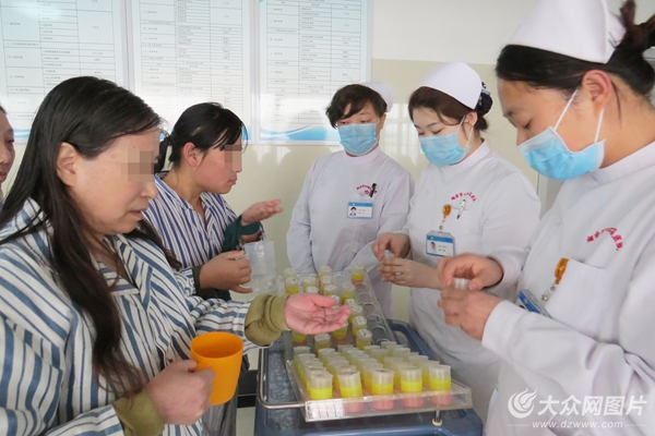上午10點,是患者的服藥時間。護士們會看著每一位患者將藥物服下。“患者需要每天按時服藥,但有些患者比較‘調(diào)皮’,會把藥藏在嘴里,趁我們不注意時再吐掉;有的甚至?xí)䲟缸约汉韲,把吃下的藥吐出來。我們必須要看著每位患者服藥,并仔?xì)檢查,確定患者將藥服下后才能放心!崩钋迦A說。