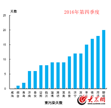 與2015年第四季度相比,2016年第四季度山東17市重污染天數(shù)有所減少。