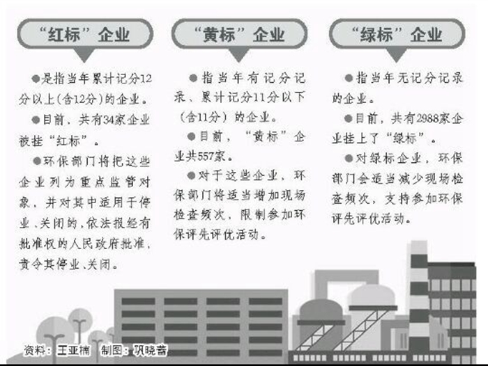 “黃標(biāo)”企業(yè),指當(dāng)年有記分記錄、累計記分11分以下(含11分)的企業(yè)。對于這些企業(yè),環(huán)保部門將適當(dāng)增加現(xiàn)場檢查頻次,限制參加環(huán)保評先評優(yōu)活動。目前,“黃標(biāo)”企業(yè)共557家。