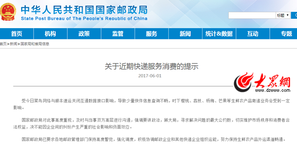 大眾網(wǎng)濟(jì)南6月2日訊 菜鳥順豐互撕事件發(fā)生后,導(dǎo)致少量快件信息查詢不暢,時(shí)下生鮮農(nóng)產(chǎn)品寄遞業(yè)務(wù)會(huì)受到一定影響。6月1日夜間,國家郵政局連夜發(fā)文稱對(duì)此事高度重視,及時(shí)與當(dāng)事雙方高層進(jìn)行溝通,決不能因企業(yè)間的糾紛產(chǎn)生嚴(yán)重的社會(huì)影響和負(fù)面效應(yīng)。6月1日,順豐速運(yùn)客服回應(yīng)大眾網(wǎng)記者稱,順豐總部正在積極溝通推進(jìn),相信很快就能恢復(fù)正常。
