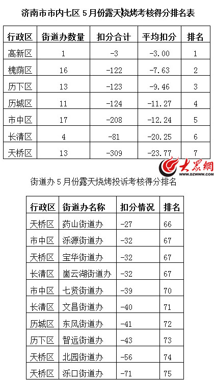 大眾網(wǎng)濟南6月2日訊 今天下午,濟南市露天燒烤治理聯(lián)合考核組、市城管委公布了5月濟南市禁燒區(qū)域投訴排名。5月份,全市共接到違規(guī)燒烤有效投訴2276件,其中油煙擾民1611件,店外經(jīng)營535件,噪音擾民116件,露天燒烤24件。5月禁燒區(qū)的考核排名中,高新區(qū)、槐蔭區(qū)排前兩名,長清區(qū)、天橋區(qū)排倒數(shù)后兩名。排名倒數(shù)后10名的街道辦中,天橋區(qū)占4個,其中北園街道辦、濼口街道辦分別為全市倒數(shù)第二、第一。(大眾網(wǎng)-山東24小時記者 賀輝)