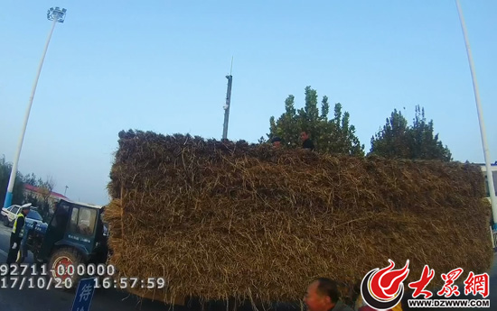 這輛超高載貨的拖拉機(jī)被查處時(shí),秸稈垛頂上還坐著裝卸工。