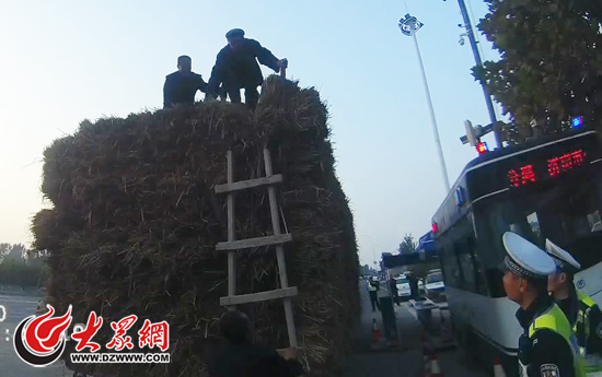 就在民警對(duì)該車做進(jìn)一步檢查時(shí),發(fā)現(xiàn)拖拉機(jī)不僅未按規(guī)定懸掛號(hào)牌,同時(shí)秸稈垛頂部還坐著3個(gè)人,沒有采取任何防護(hù)措施,存在較大安全隱患。在民警的協(xié)助下,這3名“高水平”乘車的裝卸工小心翼翼的逐一下了車。
