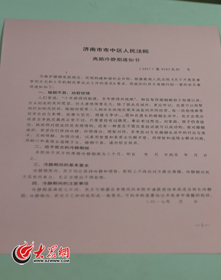 濟(jì)南市市中區(qū)法院推出“離婚冷靜期”制度以來,已經(jīng)發(fā)出3份冷靜通知書