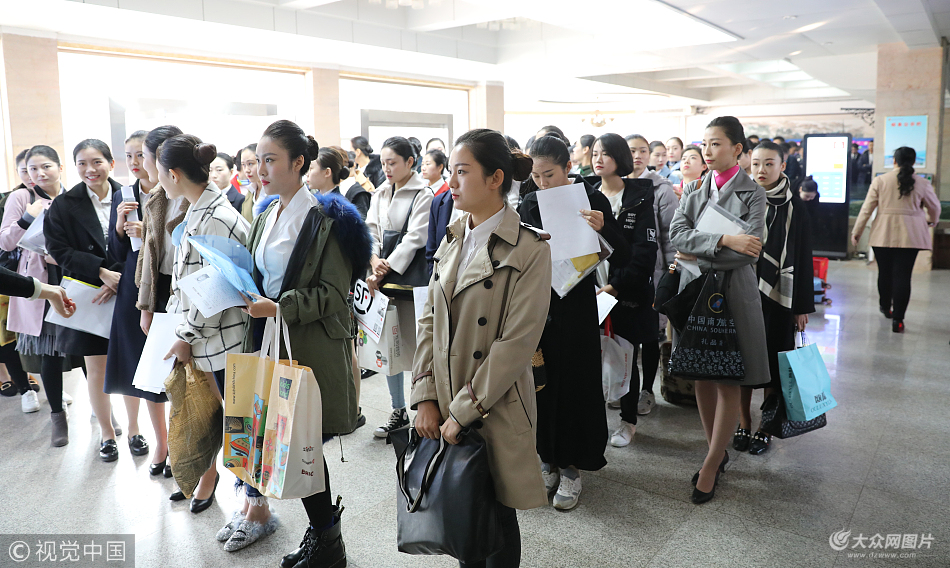 2017年11月3日,青島,準(zhǔn)備參加?xùn)|航山東分公司空乘人員復(fù)試的美女、帥哥正在青島旅游學(xué)校大廳內(nèi)等候,準(zhǔn)備再次接受評(píng)委的面試審核。