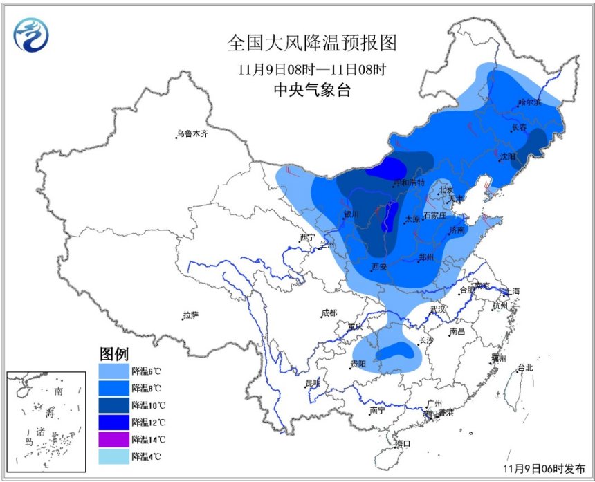 中央氣象臺11月9日06時繼續(xù)發(fā)布寒潮藍(lán)色預(yù)警: