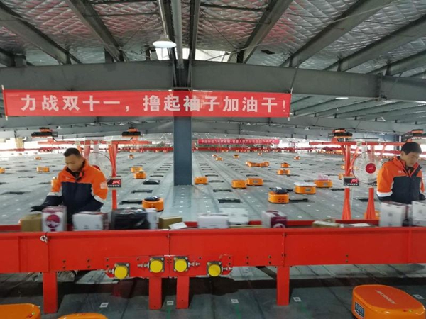 11月10日,記者走進(jìn)臨沂申通產(chǎn)業(yè)園,寫著“力戰(zhàn)雙十一,擼起袖子加油干!”的橫幅映入眼簾,黃色機(jī)器人馱著包裹在2000平方米的分揀場地上跑得正歡!耙郧胺Q重、掃碼、分揀都是我們?nèi)斯ね瓿,現(xiàn)在只要把包裹放到‘小黃人’身上,它就都做了!惫ぷ魅藛T告訴記者。