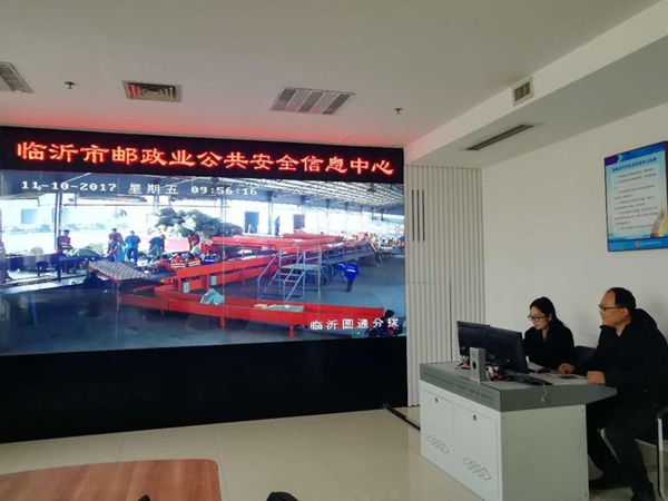 11月10日,臨沂市郵政業(yè)公共安全信息中心的屏幕上,顯示著圓通分撥中心現(xiàn)場分揀實(shí)況。
