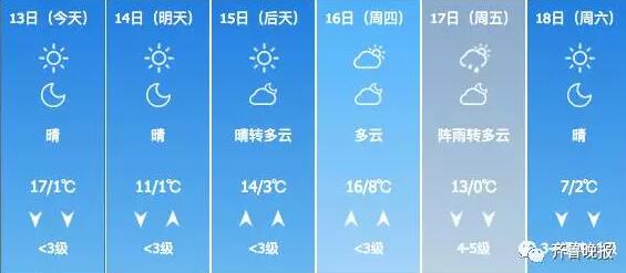 13日夜間到14日晴,北風2~3級,最低氣溫濟陽、商河、章丘-1℃左右,有冰凍,市區(qū)及其他縣區(qū)1℃,最高氣溫11℃左右。