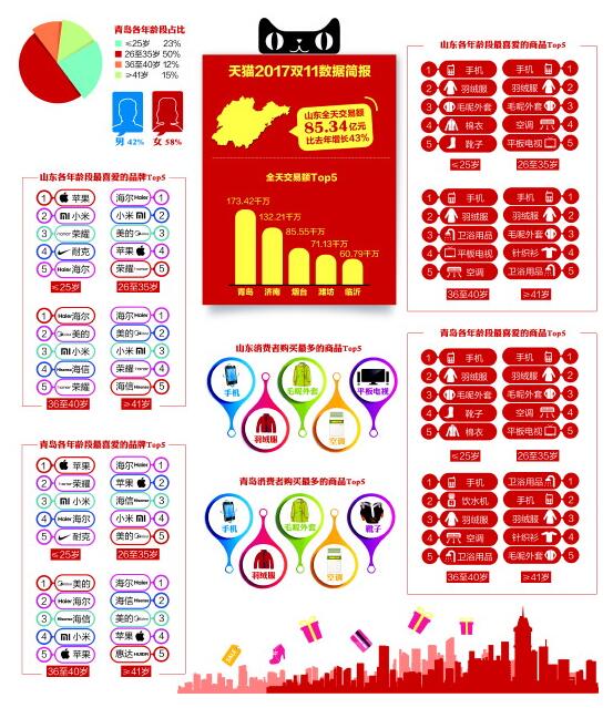 大眾網(wǎng)11月13日訊 11秒,1億;28秒,10億;3分01秒,100億;40分12秒,500億……至11月11日24時(shí),“2017天貓雙11全球狂歡節(jié)”直播大屏上交易數(shù)據(jù)定格在1682億元,無(wú)線交易占比90%,創(chuàng)下了新的紀(jì)錄。昨日,記者從阿里巴巴方面了解到,今年雙11,山東省全天交易額達(dá)到85.34億元,其中青島全天交易額達(dá)17.3億元,位居全省17地市首位。而在這場(chǎng)消費(fèi)狂歡中,手機(jī)、羽絨服、毛呢外套最受青島消費(fèi)者的喜愛。島城企業(yè)則搭上雙11快車連創(chuàng)佳績(jī),新零售能量全面爆發(fā)。