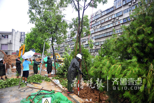 近日,在濟南飲虎池街,施工人員正在重新規(guī)劃好的綠化帶中種植植被。 記者 王媛 攝