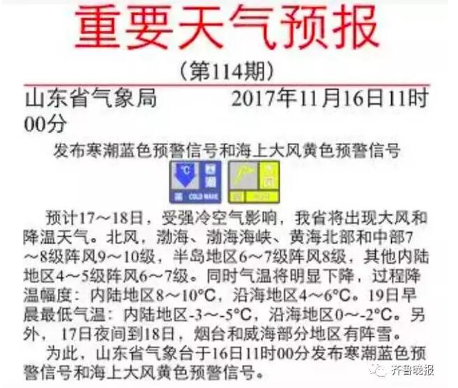 大眾網(wǎng)11月16日訊 剛剛,濟(jì)南市氣象局發(fā)布了寒潮藍(lán)色預(yù)警信號(hào)!據(jù)目前氣象資料分析,受寒潮影響,17~18日濟(jì)南將迎來(lái)入秋以來(lái)最寒冷天氣。