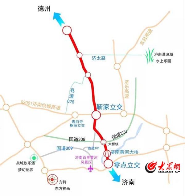 G104京福線濟(jì)南德州界至大橋鎮(zhèn)段改建工程項目全長29.7公里,一級公路標(biāo)準(zhǔn),途經(jīng)濟(jì)陽縣、天橋區(qū)的太平鎮(zhèn)、孫耿鎮(zhèn)和大橋鎮(zhèn),與青銀高速公路相交形成靳家互通立交,止于大橋鎮(zhèn)220國道、308國道交叉口。