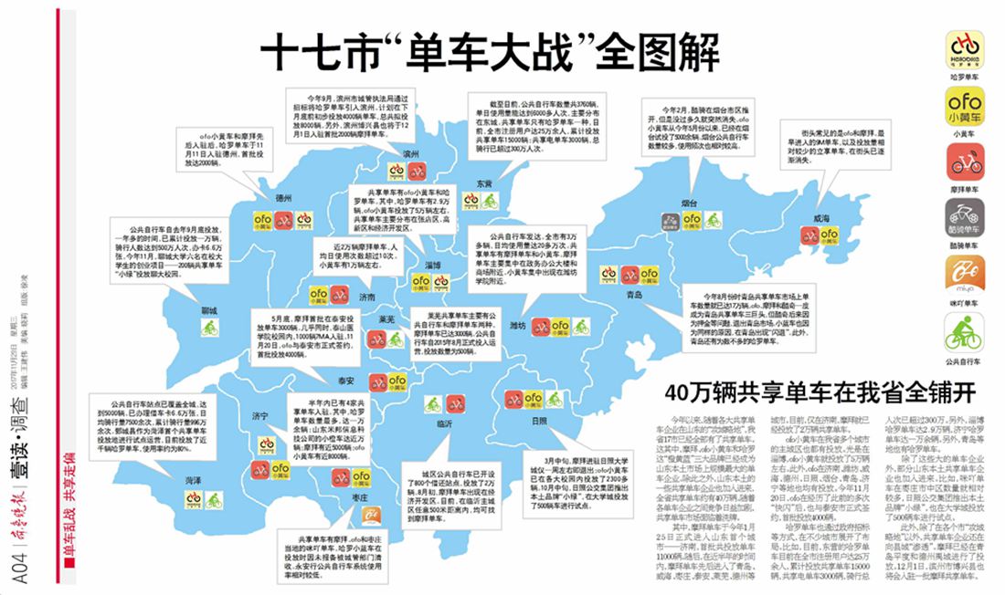 其中,摩拜單車(chē)于今年1月25日正式進(jìn)入山東首個(gè)城市——濟(jì)南,首批共投放單車(chē)11000輛。隨后,在近半年的時(shí)間內(nèi),摩拜單車(chē)先后進(jìn)入了青島、威海、棗莊、泰安、萊蕪、德州等城市。目前,僅在濟(jì)南,摩拜就已經(jīng)投放了2萬(wàn)輛共享單車(chē)。
