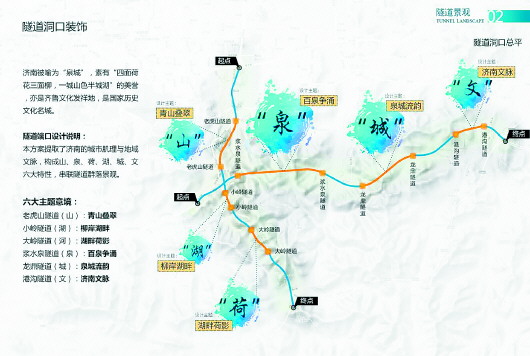 記者了解到,兩個項目中的隧道口設(shè)計提取了濟(jì)南的城市肌理與地域文脈,分別以山、湖、荷、泉、城、文為主題,串聯(lián)了隧道群落景觀。其中,老虎山隧道“青山疊翠”、大嶺隧道“湖畔荷影”、小嶺隧道“柳岸湖畔”、漿水泉隧道“百泉爭涌”、龍鼎隧道“泉城流韻”、港溝隧道“濟(jì)南文脈”。