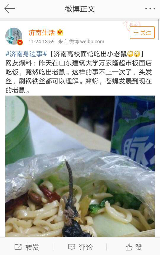 微博爆料稱“濟(jì)南高校面館吃出小老鼠”