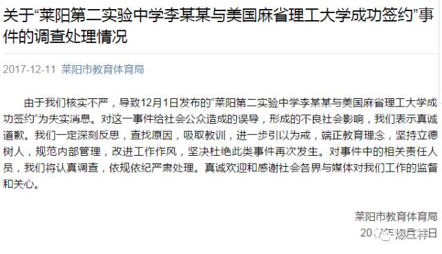 對此,萊陽市成立了由教育體育局牽頭的事件相關(guān)調(diào)查組,同時(shí),煙臺市多個(gè)相關(guān)市直部門也介入調(diào)查。11日晚,萊陽市教育體育局公布調(diào)查結(jié)果:“由于我們核實(shí)不嚴(yán),導(dǎo)致12月1日發(fā)布的‘萊陽第二實(shí)驗(yàn)中學(xué)李某某與美國麻省理工大學(xué)成功簽約’為失實(shí)消息!