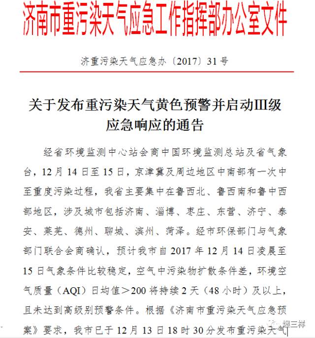 經(jīng)省環(huán)境監(jiān)測中心站會商中國環(huán)境監(jiān)測總站及省氣象臺,12月14日至15日,京津冀及周邊地區(qū)中南部有一次中至重度污染過程,我省主要集中在魯西北、魯西南和魯中西部地區(qū),涉及城市包括濟(jì)南、淄博、棗莊、東營、濟(jì)寧、泰安、萊蕪、德州、聊城、濱州、菏澤。經(jīng)濟(jì)南市環(huán)保部門與氣象部門聯(lián)合會商確認(rèn),預(yù)計濟(jì)南市自2017年12月14日凌晨至15日氣象條件比較穩(wěn)定,空氣中污染物擴(kuò)散條件差,環(huán)境空氣質(zhì)量(AQI)日均值>200將持續(xù)2天(48小時)及以上,且未達(dá)到高級別預(yù)警條件。根據(jù)《濟(jì)南市重污染天氣應(yīng)急預(yù)案》要求,已于12月13日18時30分發(fā)布重污染天氣黃色預(yù)警,并于12月14日0時啟動重污染天氣Ⅲ級響應(yīng)。預(yù)警期間采取的應(yīng)急響應(yīng)措施包括: