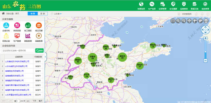 記者了解到,目前,山東農(nóng)藥監(jiān)管圖已經(jīng)完成對全省261家農(nóng)藥企業(yè)的空間位置標注,實現(xiàn)了全省農(nóng)藥企業(yè)全覆蓋。并根據(jù)監(jiān)管的內(nèi)容和類別,分別繪制了農(nóng)藥生產(chǎn)類型專題圖、化工園區(qū)專題圖、注冊日期專題圖、生產(chǎn)數(shù)據(jù)專題圖、農(nóng)藥登記許可專題圖、農(nóng)藥產(chǎn)品許可專題圖等12張專圖,利用大數(shù)據(jù)、云計算等技術,根據(jù)大量的歷史生產(chǎn)及銷售數(shù)據(jù),為實施精準農(nóng)藥管理與宏觀決策提供大量的數(shù)據(jù)支持,有利于農(nóng)藥信息的可持續(xù)化管理,從而更好的為農(nóng)業(yè)生產(chǎn)、農(nóng)民增收服務。