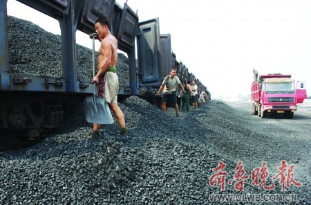 27日,在濰坊市煤炭交易市場,十幾節(jié)裝滿晉煤的車皮正?吭谠屡_(tái)上,工人們正在緊張卸煤。 王媛 攝