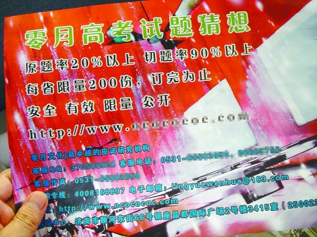 該男子讓記者稍等,隨后出門(mén),一分鐘之后,該男子拿回一張彩頁(yè),封面印有“零月高考試題猜想”幾個(gè)大字。宣傳彩頁(yè)稱:“原題率20%以上,切題率90%以上,每省限量200份,訂完為止!