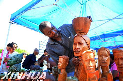 5月13日,來自津巴布韋首都哈拉雷的非洲藝術(shù)家塔皮瓦在濟(jì)南泉城廣場展示其創(chuàng)作的雕刻作品。