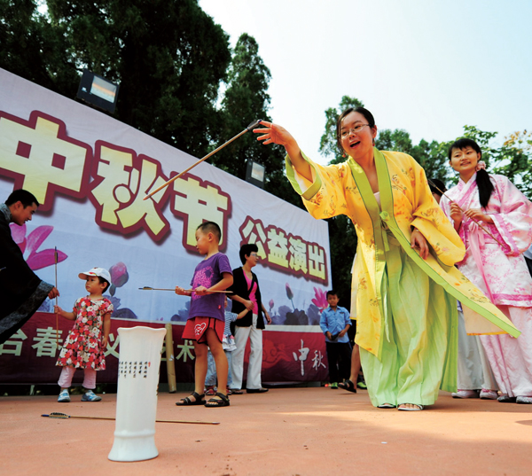 9月11日,大學(xué)生在煙臺市南山公園參加戰(zhàn)國時流行的宴飲游戲——投壺。當(dāng)日,來自魯東大學(xué)、山東工商學(xué)院和煙臺大學(xué)的漢文化愛好者身著傳統(tǒng)漢服,按照傳統(tǒng)舉行祭月、投壺和漢服展示活動,喜迎中秋佳節(jié)。