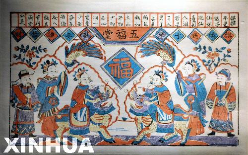 這是展出的木版年畫《五福堂麒麟送子》(12月29日攝)。新華社記者 陳曄華 攝